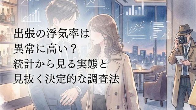 パートナーの出張に不安を感じる方は少なくありません。実際に統計上の出張の浮気率は高く、特に30代40代でリスクが急増します。今回は出張の浮気率が高い心理的理由から、スマホやLINEで嘘を見抜く調査法まで徹底解説。怪しい兆候を見逃さず、確実な証拠を掴むための知識を提供します。